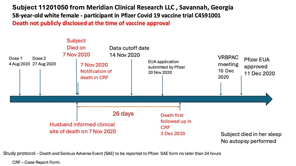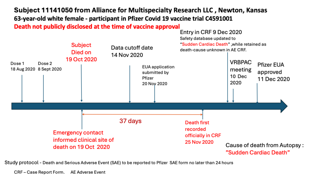 Subject 11141050[17] from Alliance for Multispecialty Research LLC , Newton, Kansas[18], in the vaccinated arm of the study, died on October 19, 2020. Contrary to Pfizer-BioNTech’s clinical trial protocol, neither Polack et al., nor the EUA submission documentation, nor the VRBPAC meeting on December 10, 2020[19], disclosed this patient’s death.
