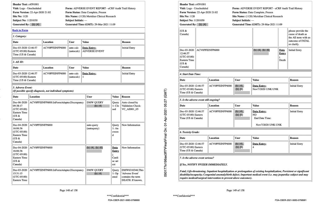 We have documentation in the publicly available Pfizer clinical trial documents that confirms the patients’ loved ones promptly communicated the subjects’ deaths to the clinical trial sites. However, in violation of legal requirements, the regulatory authorities were apparently not informed of these deaths within the specified time frame. The critical time period under scrutiny is the issuance of the EUA on December 11, 2020, which relied upon the clinical trial data collected through November 14, 2020. Beyond the ethical issues raised, which I have highlighted, there are legal obligations to promptly report deaths to local regulatory authorities, a practice essential for ensuring trial subjects’ safety.