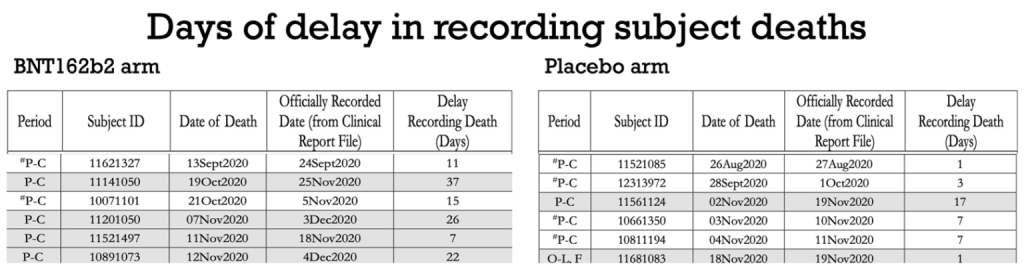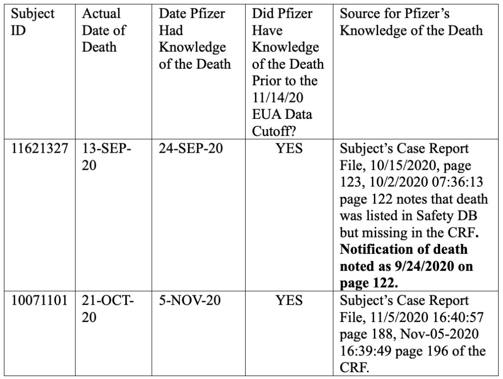 To determine how the discrepancies in reported deaths occurred, we started with the premise that, as of November 14, 2020, Pfizer-BioNTech was not informed of any deaths during the trial. The only way in which that could be validly disproved was demonstrating, through publicly available records, that Pfizer-BioNTech had knowledge of the deaths. By painstakingly going through each of the patient’s notes publicly available on the Public Health and Medical Professionals for Transparency (PHMPT) website, we identified the six dead subjects, whose deaths were reported in the initial Polack publication and VRBPAC meeting on December 10, 2020. They are vaccinated subjects 11621327 and 10071101, as well as the unvaccinated subjects 11521085, 12313972, 10661350, and 10811194. Their deaths occurred prior to November 14, 2020, and there was documentation of their deaths prior to November 14, 2020, in their respective CRFs.