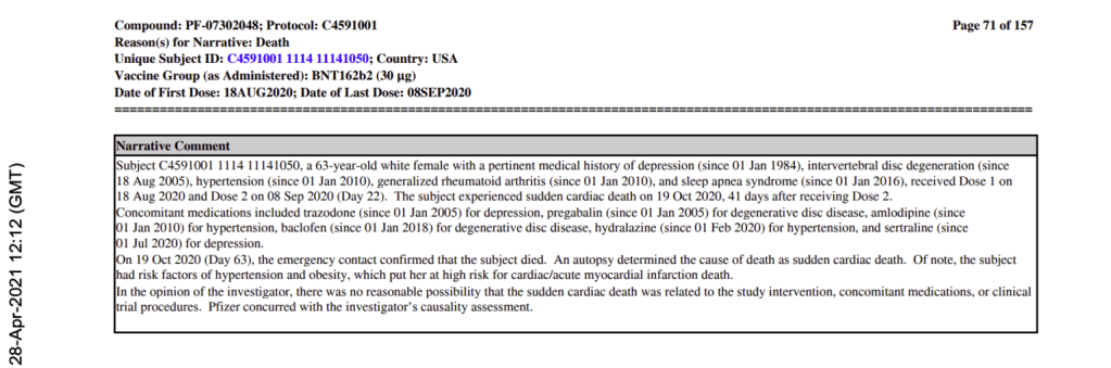 Per the autopsy, the patient died from ‘sudden cardiac death,’ with her known risk factors of hypertension and obesity putting her at high risk of cardiac-acute myocardial infarct. The clinical site staff entered the specific diagnosis of “sudden cardiac death” into her notes on December 9th, 2020, the day before the VRBPAC meeting on December 10th, 2020, which suggests that this hidden death also had autopsy results available at the critical juncture of consideration of the vaccine’s Emergency Use Authorization.
