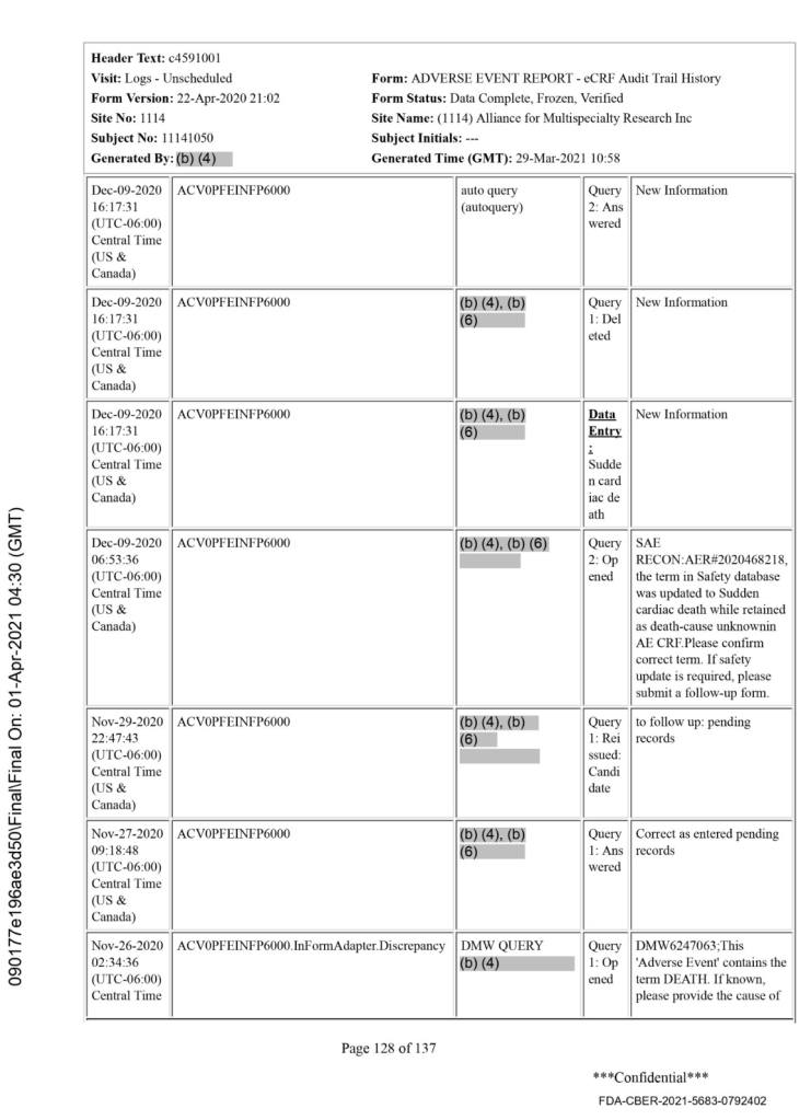 As such, this subject’s death should have been reported publicly in the VRBPAC meeting as well as the NEJM publication, as it had happened well within the reporting period prior to Nov 14th, 2020, and the clinical site documented it. Why wasn’t it?