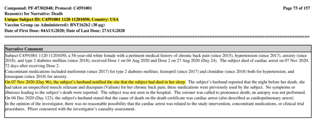The death occurred well before the data cut-off date of November 14, 2020. The public lacks access to any of the original clinical trial records, specifically Pfizer Safety’s Vaccine SAE Reporting Form for subjects. However, from the patient narratives (Pfizer, 2023, p. 71), it is evident that the emergency contact confirmed on the day of death (October 19, 2020) that the subject had died. The narrative documents further state that the subject had an autopsy, determining the cause of death to be “sudden cardiac death.”